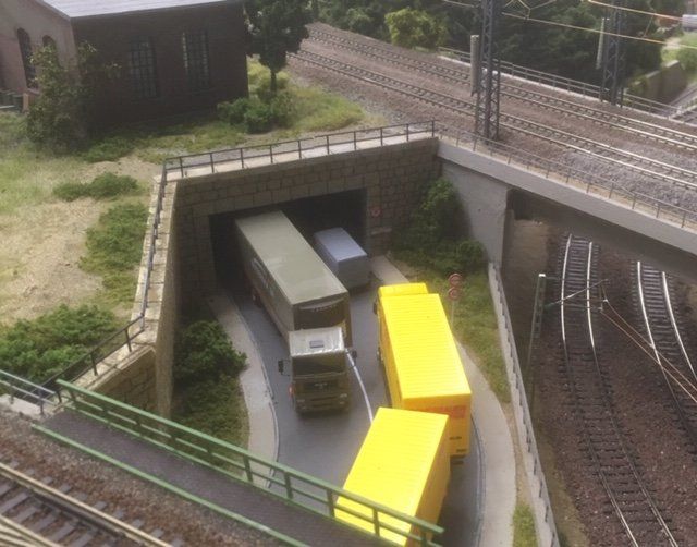 In diesem Jahr bauten wir im Bereich des Dampflok-Betriebswerks weiter. Zuerst mussten die angrenzenden Gleise im Bahnhof geschottert werden. Dann konnten wir die Platte mit dem BW einsetzen. Anschließend verbanden wir die Gleise zum alten Anlagenteil. Der Anschluss der Landschaft im Bereich des Bahndamms war nicht einfach, da alles von der Arbeitsbühne von oben her zu machen war. Eine schwierige Aufgabe war auch die Weiterführung der Unterführung. Diese endet jetzt in einem Tunnel unter dem BW. In diesem Bereich befinden sich in mehreren Stockwerken, Gleistrassen und ein Schattenbahnhof.